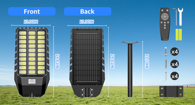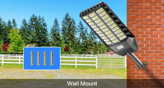 30% brightness when no one passes by; 100% brightness when someone passing by; 2. Timed Lighting: Timed 100% brightness 2/3/5/6/8 hours; 3. Always : Always 100% brightness lighting. (in this mode you can adjust the brightness of street lights: 25%-100% brightness, remote control distance up to 35 ft)
