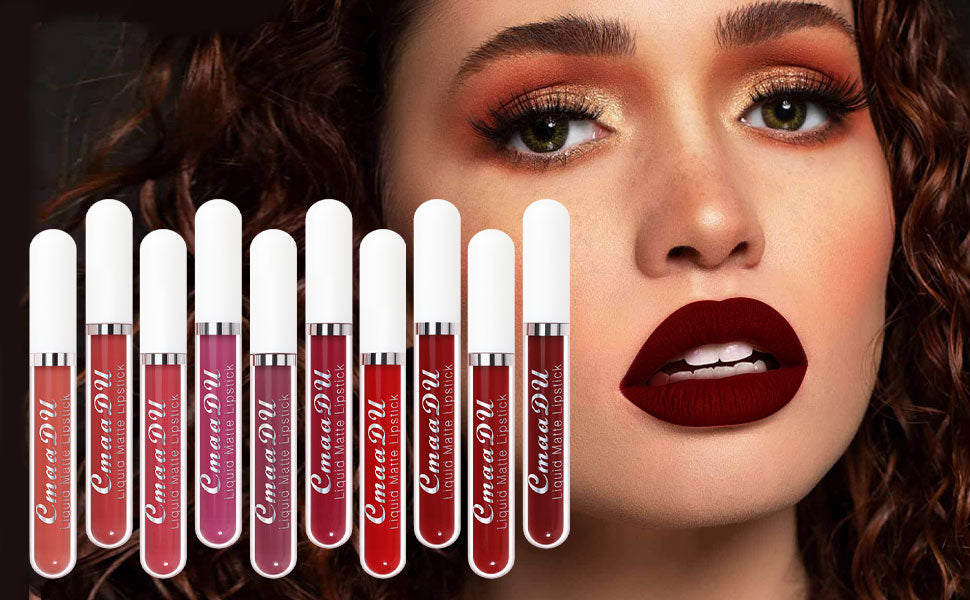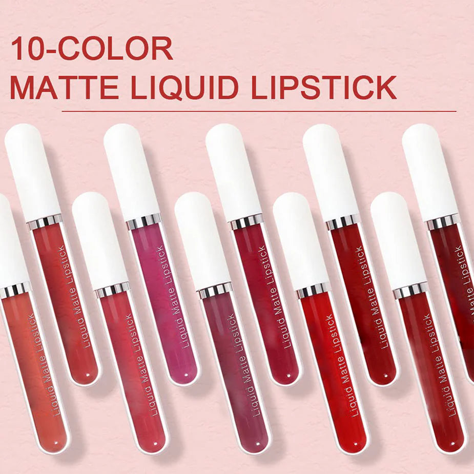- 10 Colors Velvet Liquid Lip Stick Set, full-size lip gloss of the most popular colors. Charming matte, long lasting and waterproof, Not stick cup, do not fade.