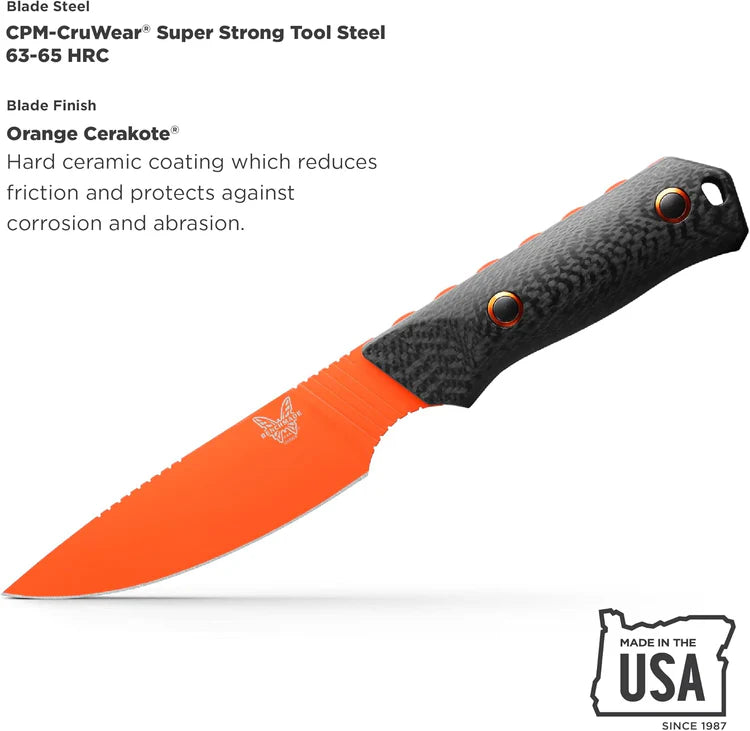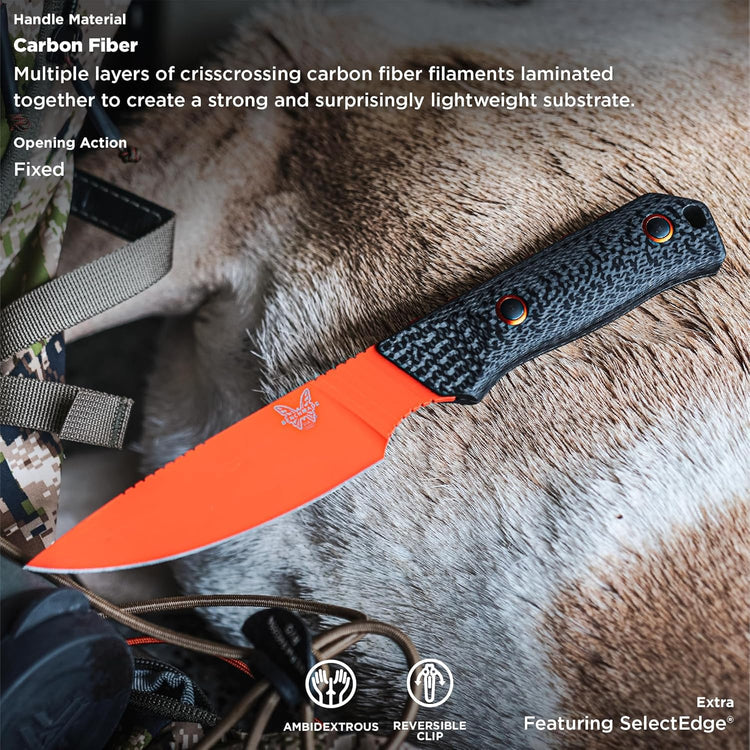 This lightweight hunting knife bares CPM-CruWear steel with ultra-sharp SelectEdge® for exceptional push-cut performance and edge durability. Hi-vis orange Cerakote® and lightweight carbon fiber add up to an uncompromised
