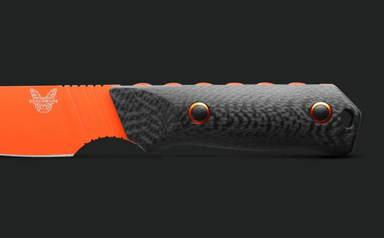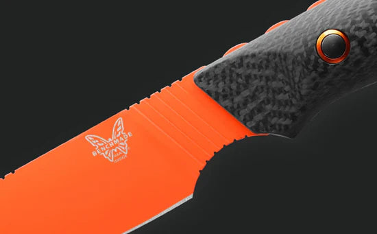 The handle scales are carbon fiber which are attached to the full tang with orange anodized collars. The spine of the blade is notched to allow a positive grip for good control when the knife is in use.