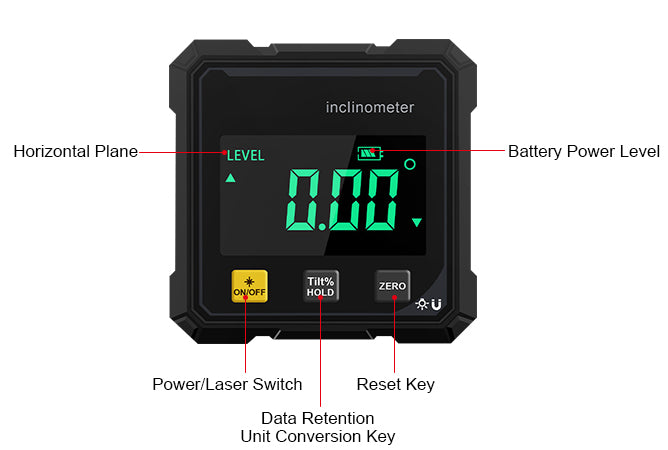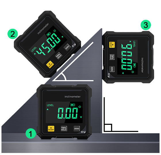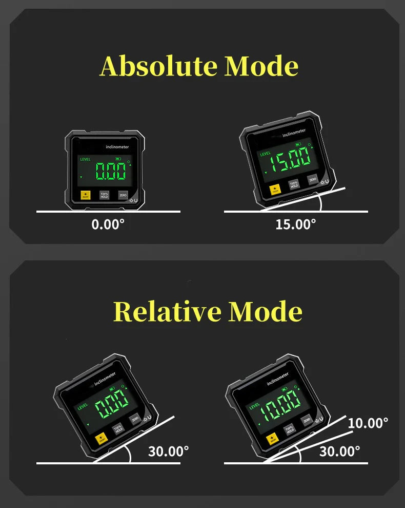 Multi-angle measurementοΌThis magnetic digital inclinometer for home or industry handles horizontal, vertical, and slope measurements with easy switching.