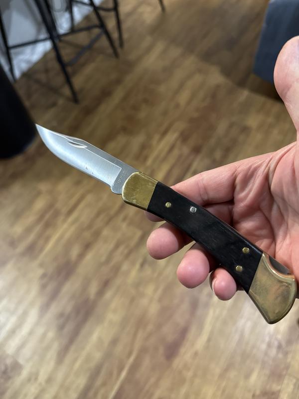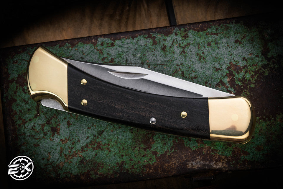 Model 110 Hunter Lockback. Brass bolster(s). Crelicam ebony wood handle.