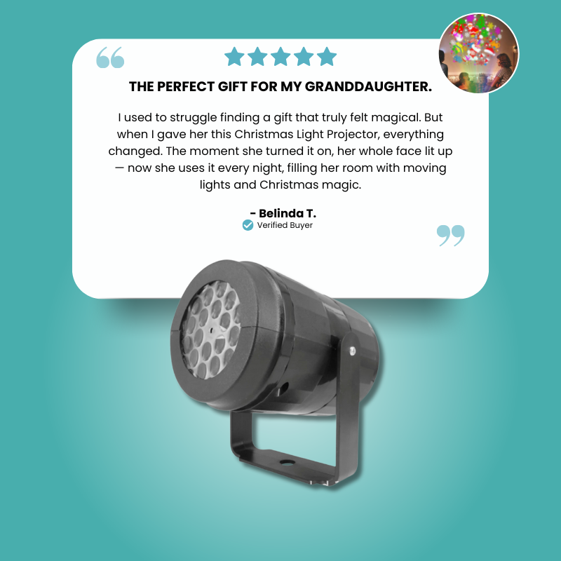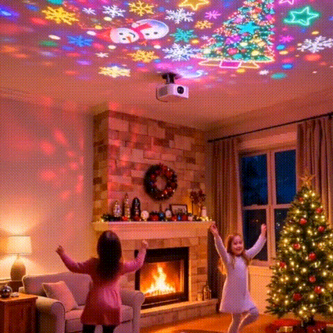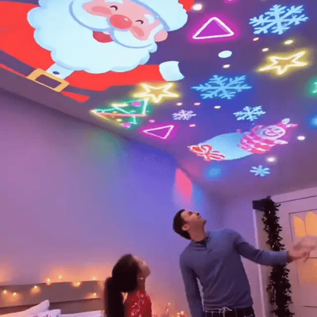 The projector fills your walls and ceiling with bright moving patterns, creating a magical holiday atmosphere for kids and adults.