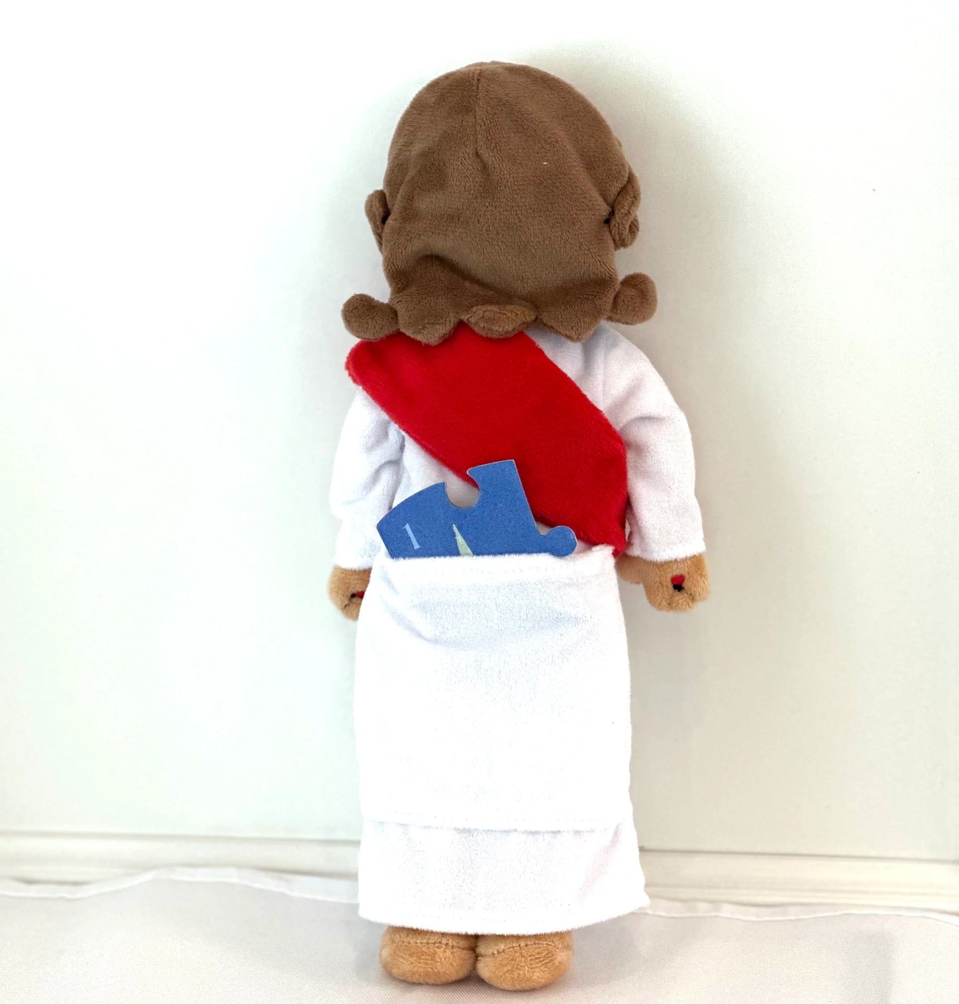 Each day during the 24-day countdown to Christmas, parents hide the 12-inch plush Jesus doll somewhere around their home and in the morning they encourage their children to find Jesus, where they will discover a double-sided puzzle piece paired with a Bible verse and illustration. As the days progress, the pieces form a beautiful picture of the Nativity, displayed in a custom puzzle frame.