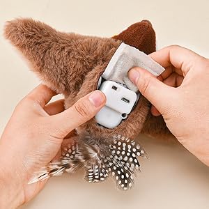 This product features a beautiful bird design. The toy comes with rechargeable batteries that power the bird to flap its wings and make chirping sounds. In addition to its realistic bird-like movements, the toy's interior is filled with catnip, which will attract your cat to come play and explore the toy. whether your cat wants to hunt the bird or just snuggle up to it, this toy is perfect for them.