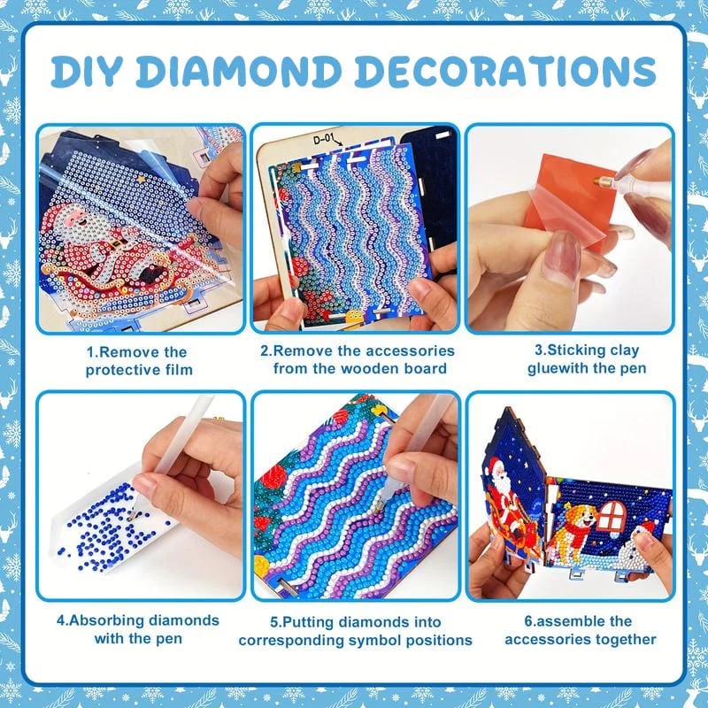 Create your very own sparkling masterpiece with this 5D diamond painting kit. The process involves placing colorful rhinestones on the pre-designed wooden house, adding a festive touch to your home. ✨🎄
