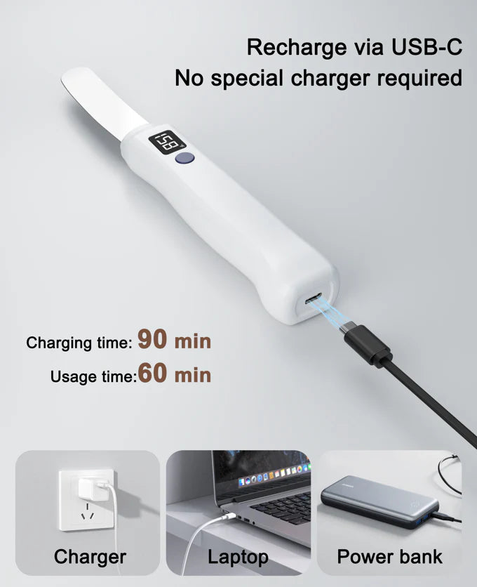 Powered by a built-in 2500mAh rechargeable battery, this heated spreader is designed to keep up with your routine. One full charge delivers up to 10 days of everyday use, so it’s always ready—no constant recharging, no interruptions.