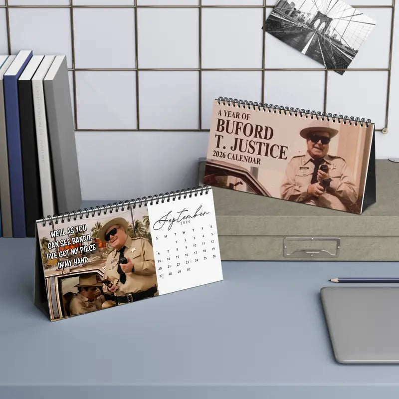 The 2026 Sheriff Buford calendar comes in two versions to suit your style. The wall calendar features bold, full-page artwork that brings character to any room, while the desk calendar offers a compact, easy-to-flip design that keeps each day organized and fun. Two formats, one unforgettable sheriff — ready to keep you company all year long.