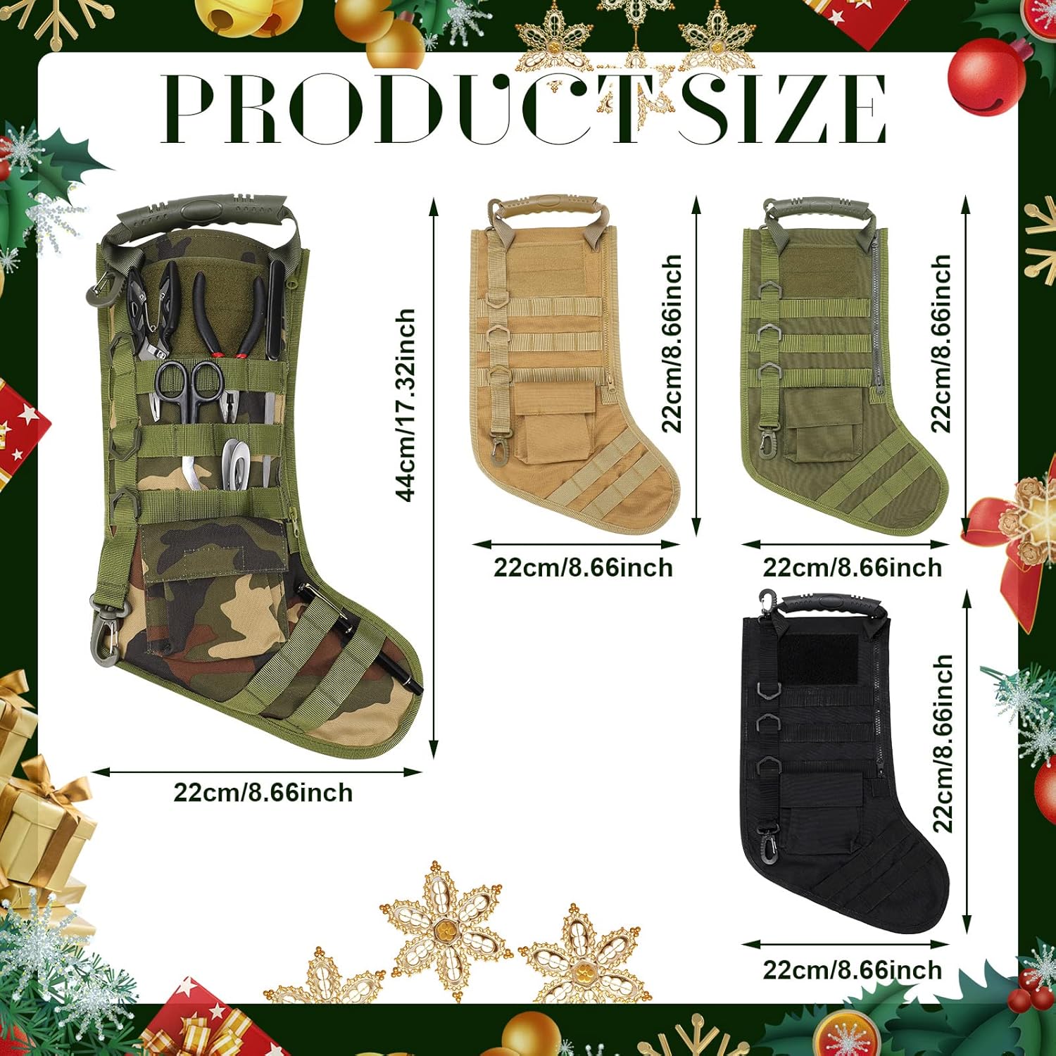 Upgrade holiday gifting and tool organization with our Tactical Christmas Stocking! It blends military - style design and festivity, ideal for gear lovers. Made with durable materials, it has MOLLE straps for customization, secure pockets for tools/gifts, and strong stitching. Great for DIYers, outdoor fans, or as a unique, practical gift. Hang it on the tree, then use it year - round to organize gear.