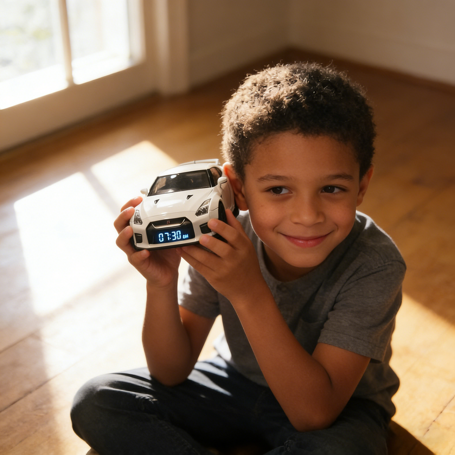 - Finish & Accents: Glossy pearl white exterior paired with matte black alloy wheels, black side skirts, and a rear spoiler—so it looks like a mini supercar, not a “toy clock.”